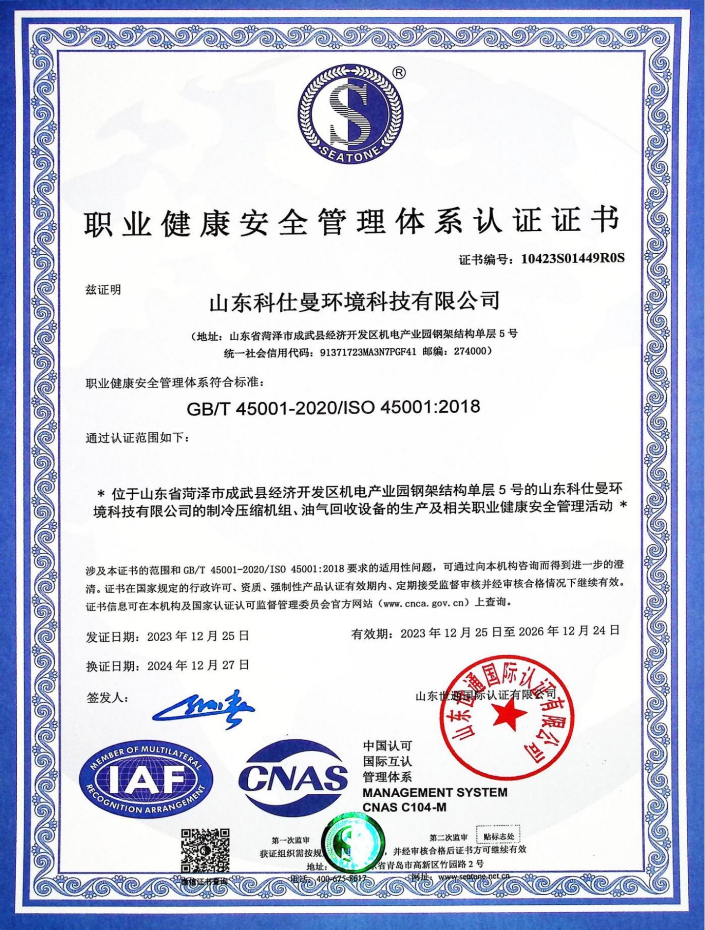 职业健康安全管理体系认证证书