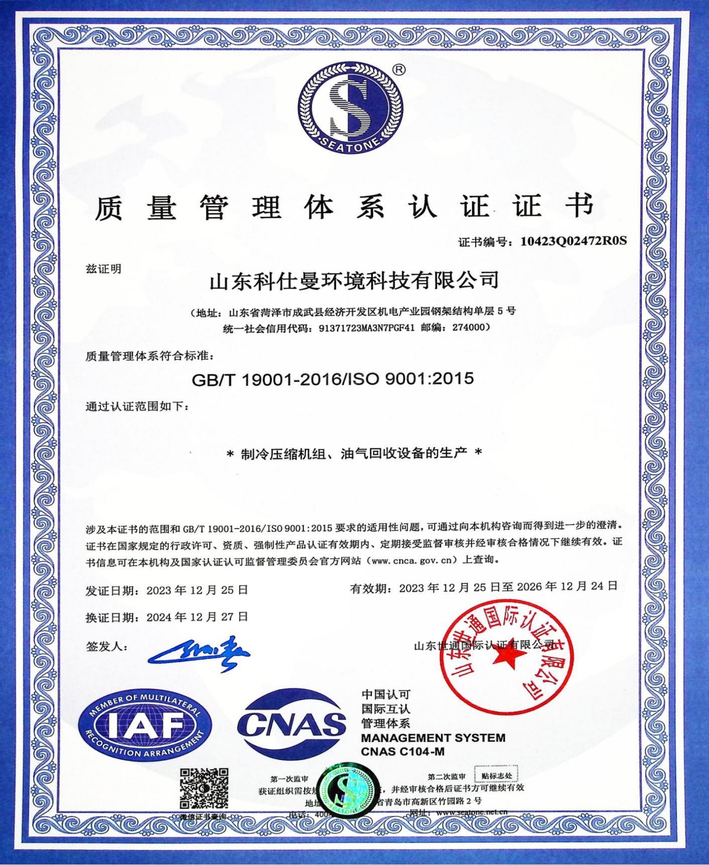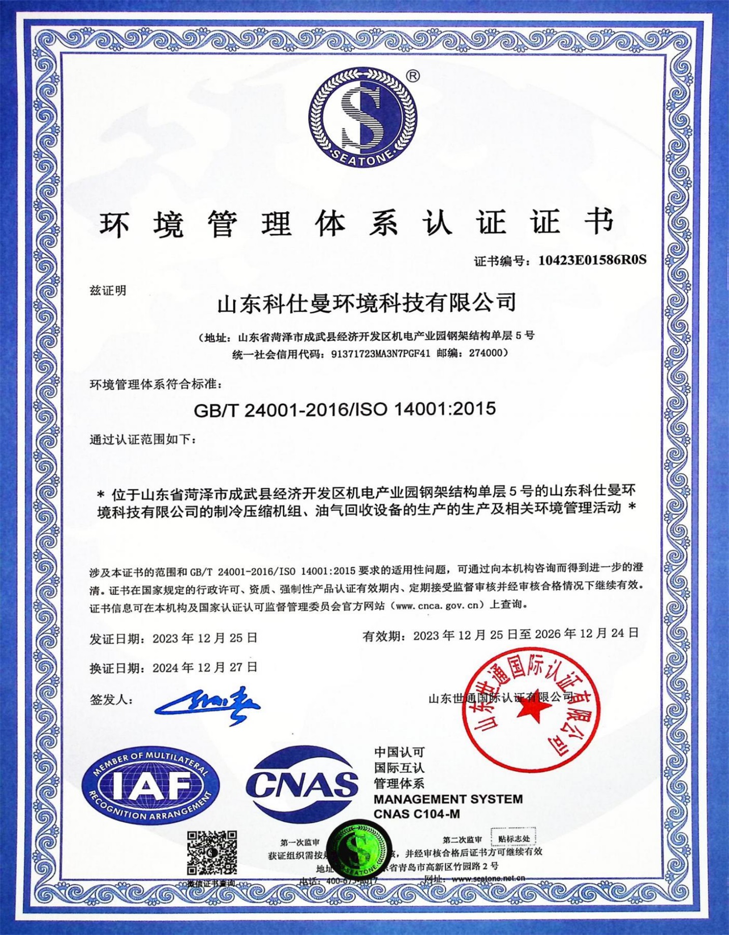 环境管理体系认证证书