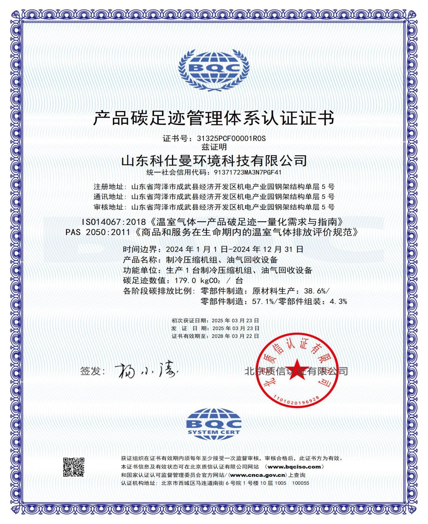 产品碳足迹管理体系认证证书