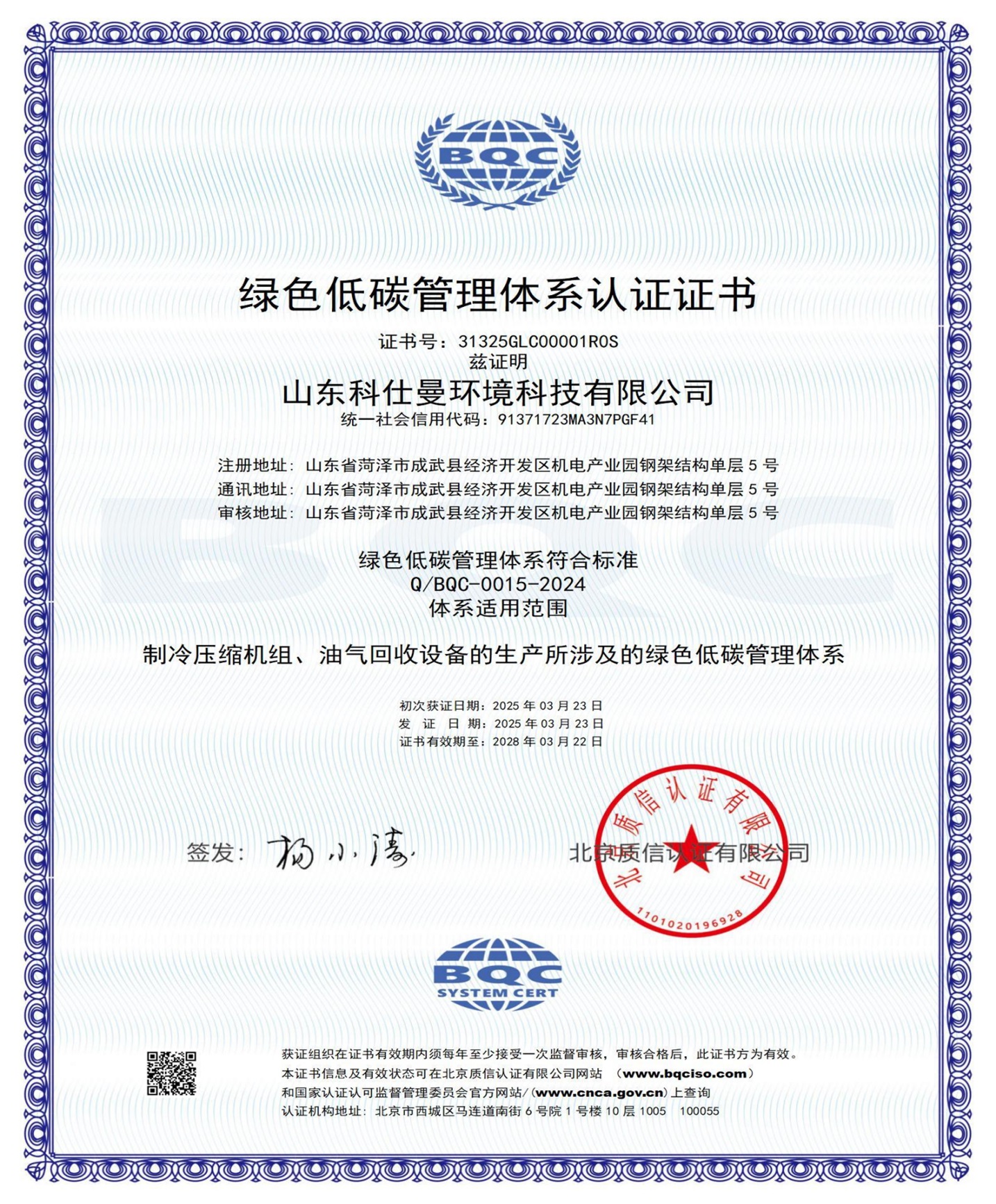 绿色低碳管理体系认证证书